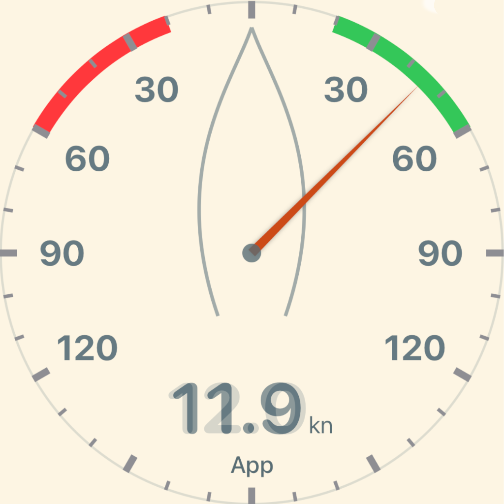 Large analog wind gauge shows apparent or true wind angle at a glance. Tap to toggle True/Apparent. Data updates smoothly via animated interpolation.